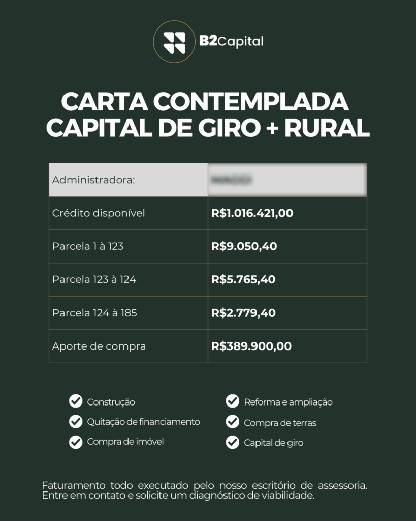 Você deixa o próprio bem como garantia ou pode fazer um capital de giro para investir em outras oportunidades. Trabalhamos com as melhores oportunidades de crédito contemplado do mercado, oferecendo acesso imediato a capital com o menor custo financeiro existente. Uma solução inteligente para crescer sem pagar juros abusivos. Veja este exemplo: